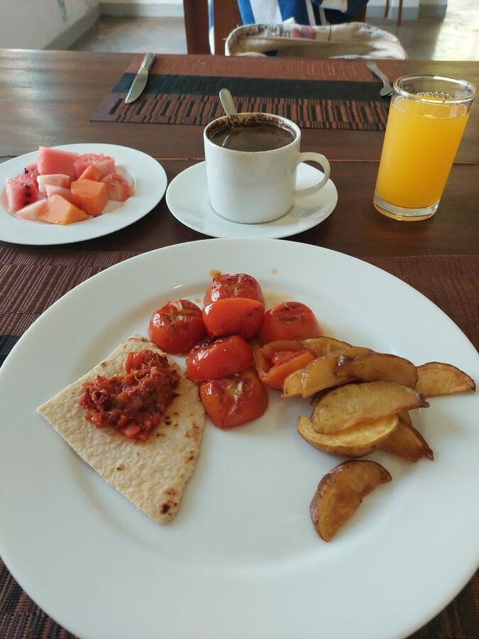 Пляж в пяти минутах от отеля. Отель простенький, но с большим и чистым бассейном (купались там после обеда). Завтраки нормальные, но без изысков. Омлет, колбаски, йогурты, кофе, фрукты. Номера простенькие, но чистые и с балконом. Ужинали тоже здесь, кафе на берегу прям и скидка минус 10% проживающим ( в остальных местах плюс 10% к прайсу)