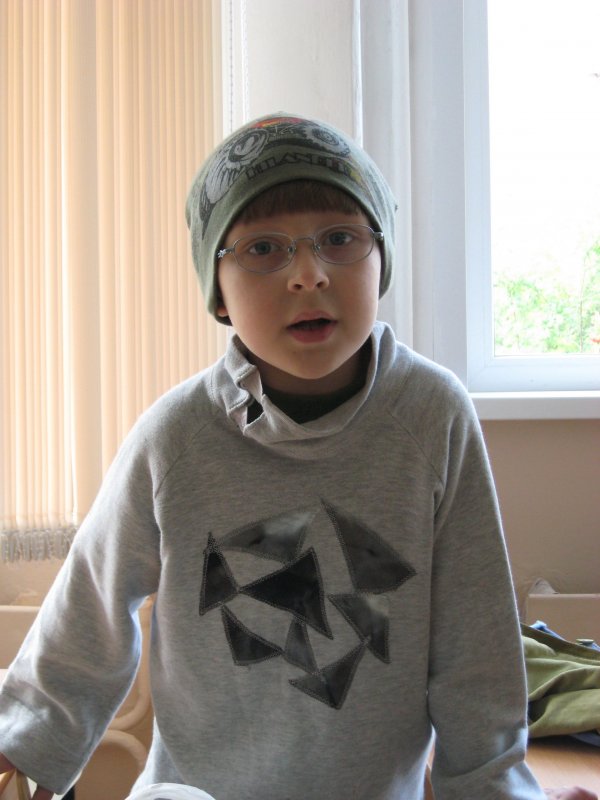 На сыне толстовка из трикотажа с вышивкой из атласа.