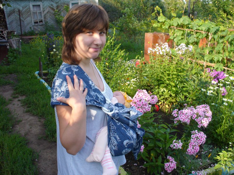 слинг с кольцами брала в роддом и потом первый месяц им пользовалась! это мы надаче у родителей мужа!
