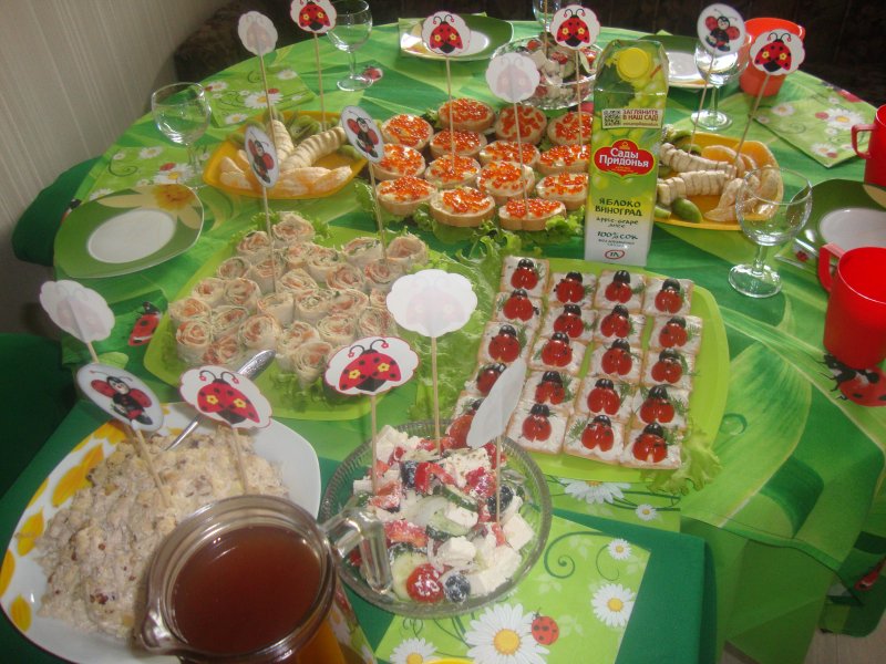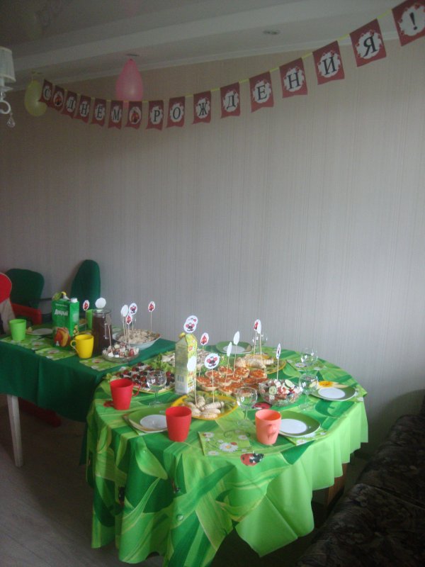 Это наши два стола, т.к. все на один не уместились. Это божья коровка подарки потрошит. Торт от жары начал течь немного, но главные герои на нём были просто классные.
