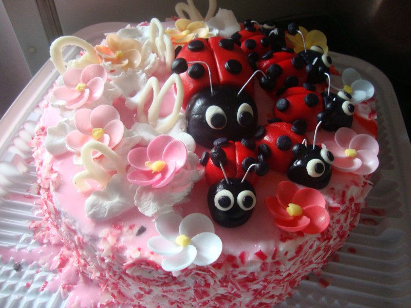Варианты были божья коровка и с машей и медведем всё оформить. Но что-то Маша уже поднадоела. У дочки спрашивали какой она тортик хочет,т.к. она всё тортик просила на ДР. Она сказала, что с божьей коровкой. Вот отсюда всё и пошло.