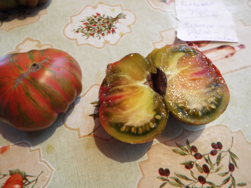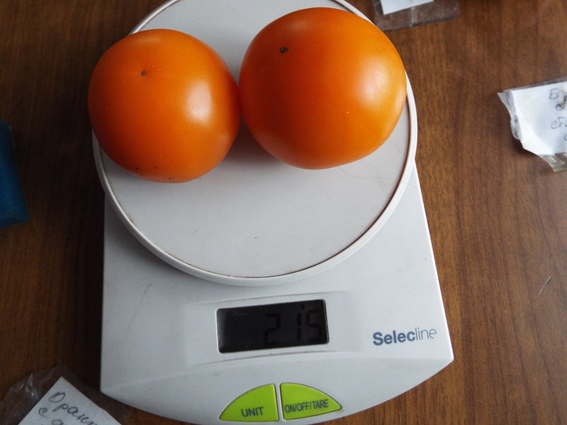 1. Оранжевые с фиолетовыми пятнами - обозначен вес 200 гр помидорка, но столько весят у меня две, не было ни одной большой, все такие. На вкус сладкие, мясистые, сочные. Все пустила на маринование.