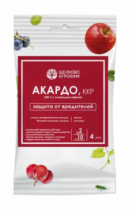 Контактный акарицид «Акардо, ККР» предназначен для борьбы с растительноядными клещами. Действующее вещество – спиродиклофен – нарушает физиологические процессы, происходящие на всех стадиях развития растительноядных клещей (яйца, личинки, взрослые самки). Такие нарушения в клетках тканей приводят к гибели клещей. Акарицидный эффект создаётся в сочетании с инновационной препаративной формуляцией (концентрат коллоидного раствора), благодаря которой «Акардо, ККР» действует на клещей с высокой скоростью в любых погодных условиях. Препарат способен уничтожить даже популяции, устойчивые к традиционным акарицидам. Кроме того, дополнительное действие он оказывает против щитовок, медяниц и цикадок.