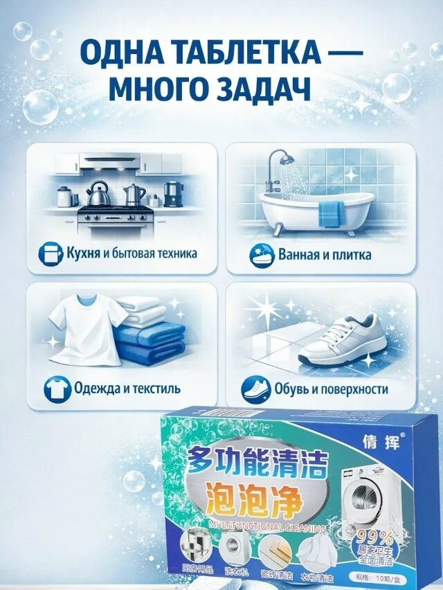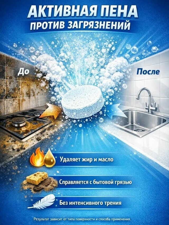 Многофункциональное чистящее средство в таблетках предназначено для комплексной уборки дома и ухода за бытовой техникой. Универсальное чистящее средство эффективно справляется с жиром, налётом, пятнами и повседневными загрязнениями на различных поверхностях, позволяя заменить сразу несколько средств для уборки. Формат таблеток обеспечивает точную дозировку и экономичный расход — достаточно растворить одну таблетку в воде, чтобы получить активный очищающий раствор. Чистящее средство для дома подходит для кухни, ванной комнаты, мебели, плитки, раковин, бытовой техники, а также для локальной очистки одежды и обуви. Универсальное средство для уборки помогает удалять жир с варочных панелей, вытяжек и кухонных поверхностей, эффективно очищает плиту, столешницы и зоны с интенсивными загрязнениями. Многофункциональное чистящее средство подходит для регулярного использования в быту.