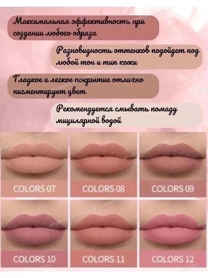 Стойкая матовая помада не сушит губы, ощущается комфортно и держится весь день. Насыщенный цвет с первого нанесения и визуальное увеличение объёма губ за счёт бархатного матового финиша всё, что нужно для чувственных губ и привлекательного образа. Помада высокопигментирована, обладает легкой быстро сохнущей текстурой, мягко покрывает губы, обеспечивая невесомое покрытие, придавая им объем и яркий стойкий оттенок, приковывающий взгляды.