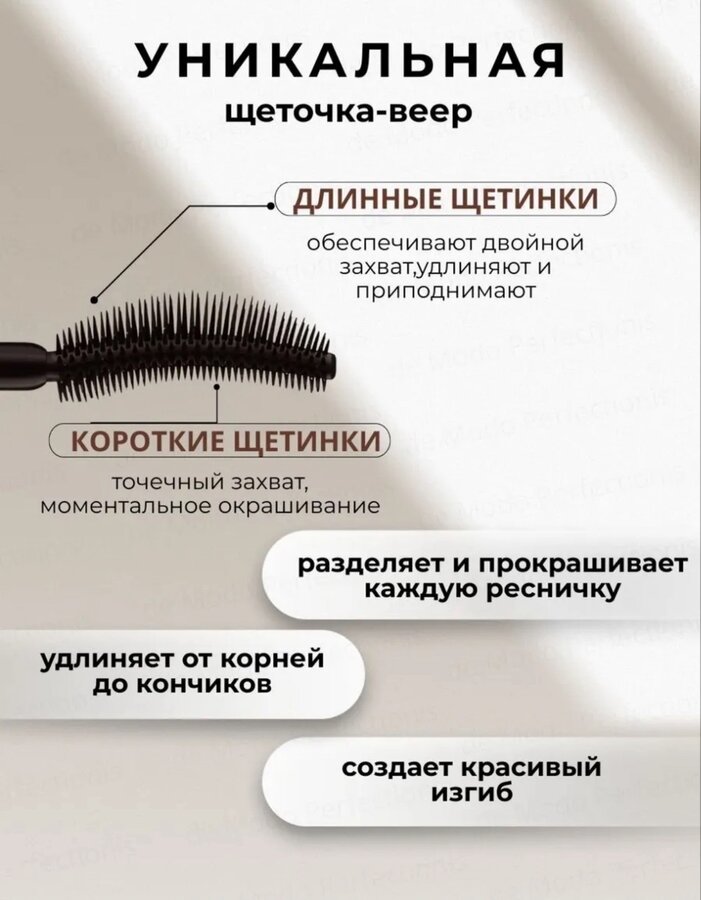 Веерообразная щеточка с разной длиной щетинок равномерно прокрашивает и разделяет ресницы.