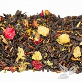 Прекрасный черный цейлонский чай с добавлением долек вишни, ягод ежевики, брусники, черноплодной рябины, кусочков клубники и ананаса. Фруктово-ягодное сочетание наполнено лепестками сафлора и листьями смородины. Аромат и вкус становится незабываемым после первой выпитой чашки. Повышает настроение и улучшает работу пищеварительных органов.