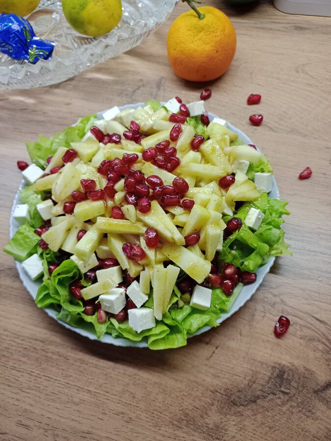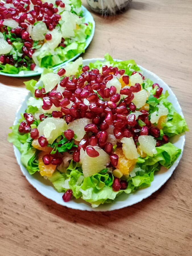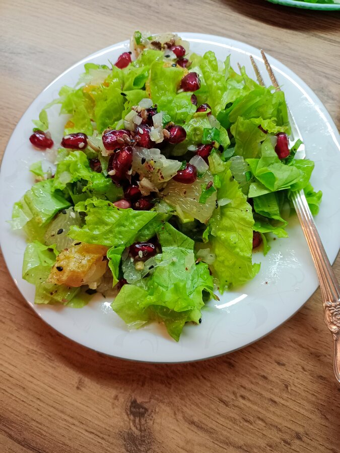 Сегодня еще один салат на испытании был , надо же все гранаты использовать. И тоже с испанского тик тока. Правда она там не дала состав соуса, пришлось использовать другой.