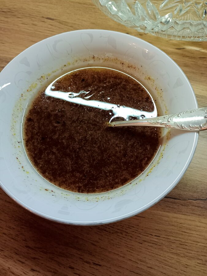 В чашечке смешать сметану с горчицей, добавить черный перец, паприку, кориандр, душицу (орегано), соль и сахар по вкусу, немного водички (если густая сметана).