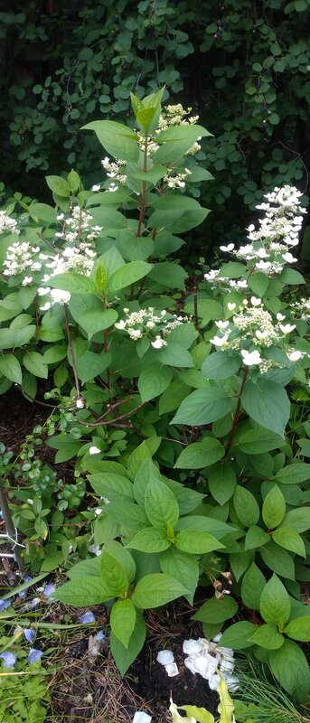 сюда не стала сажать гортензии, посадила микс из многолетников, которым не страшно обламывание верхушек : хосты, флоксы, астильбу, мяту (удобно в чай собирать), вербейники, лилейники, горец (он кстати вырастает 1-1,5м раскидистый пахучий с белыми метелками) - все прекрасно цветет и выживает, однолетники еще тыкаю туда , близко к отмостке : бархатцы, астры, львиный зев