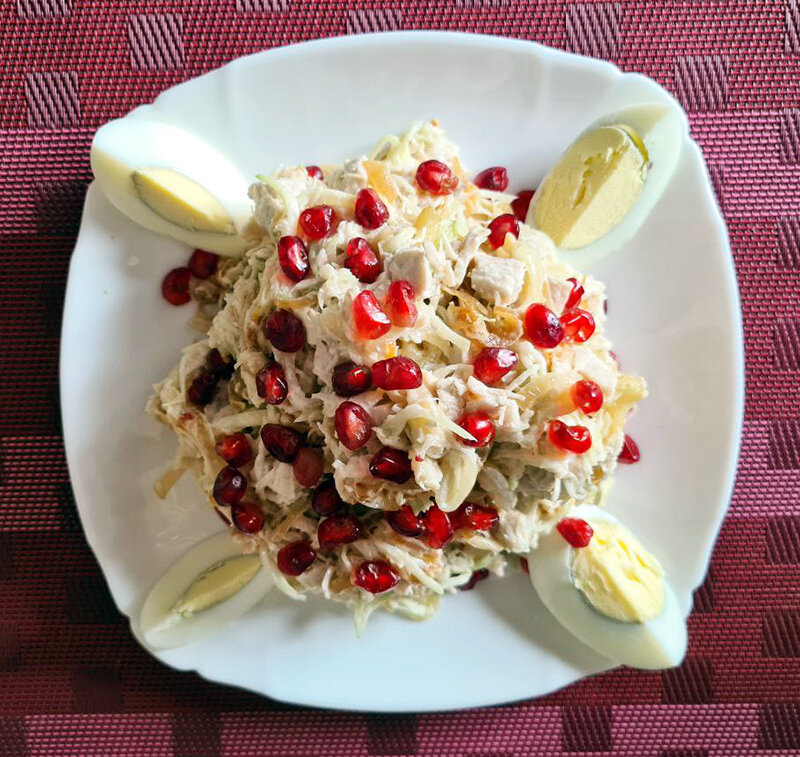 Яйцо использовала как декор. Как и гранат. В классическом варианте яйцо используют именно как декор. Пробовала как-то порубить в салат яйцо, не понравилось., вкус упрощается. Гранат, конечно, не обязателен. Это чисто для украшения.