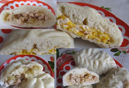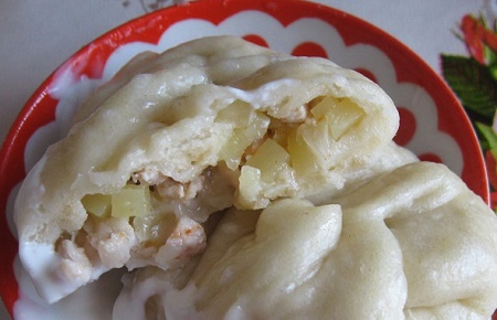 Ну и начинок я делаю две, одну стандартную – мясо, капуста, лук (это для семьи) и вторую для себя, т.к. мне категорически нельзя капусту – курица, тыква и лук. В начинке у нас мяса больше по объему, чем капусты или примерно одинаково, хотя встречала варианты и наоборот. Кстати, если для начинки взять только тыкву и лук – получится постный вариант этого блюда. Готовлю в пароварке, это количество как раз влезает в 2 корзины пароварки Браун.