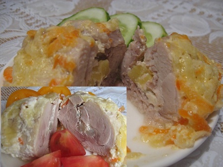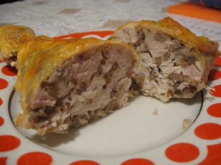 Начинка 2: куриное филе – примерно 120 г, тыква – примерно также, ½ луковицы (добавляйте по вкусу), перец, чеснок, приправы.