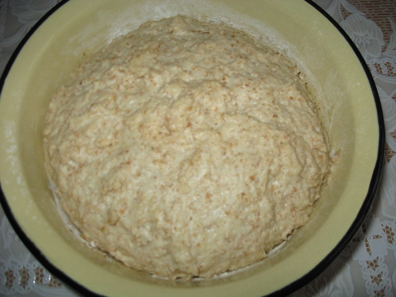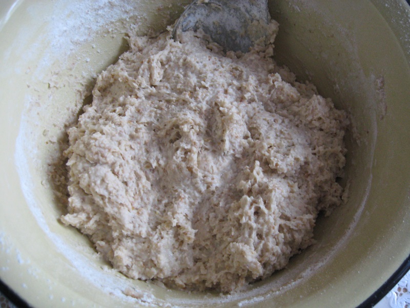 Тесто должно подойти дважды, каждый раз увеличиваясь в объеме примерно в 2 раза. Я его каждый раз после подъема вымешиваю, добавляя муку. В итоге, после второго подъема мука ушла почти вся.