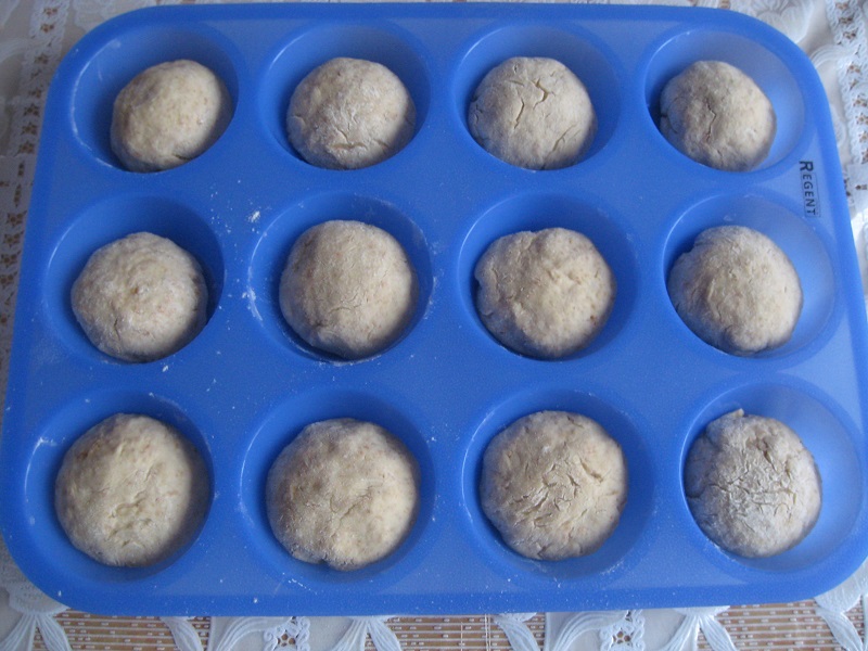 3) Дальше тоже облегчила процесс. На силиконовый коврик насыпала муки. С помощью ложки выложила на коврик 12 одинаковых порций теста (у меня порция получалась около 1/2-1 ст.л.). Руки посыпала мукой, обваляла каждую порцию в муке и руками скатала в шарики. Шарики сразу складывала в силиконовую форму (диаметр дна 5см, верха 7см, высота 3 см). Поэтому булочки у меня небольшие.