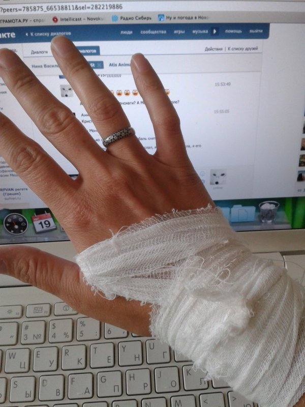 Я не порезала, у меня киста какая-то то ли в связке, то ли в суставе, я в этом не шарю. Но болело очень, вообще ничего не могла-даже зубы почистить нормально. Ну и короче мне в эту шишку поставил укол и велели несколько дней не давать нагрузку на руку. Вот забинтовалась, сижу. :aga-aga: А сегодня флакончики получила - руки так и чешутся пшикать, а низя... :-(