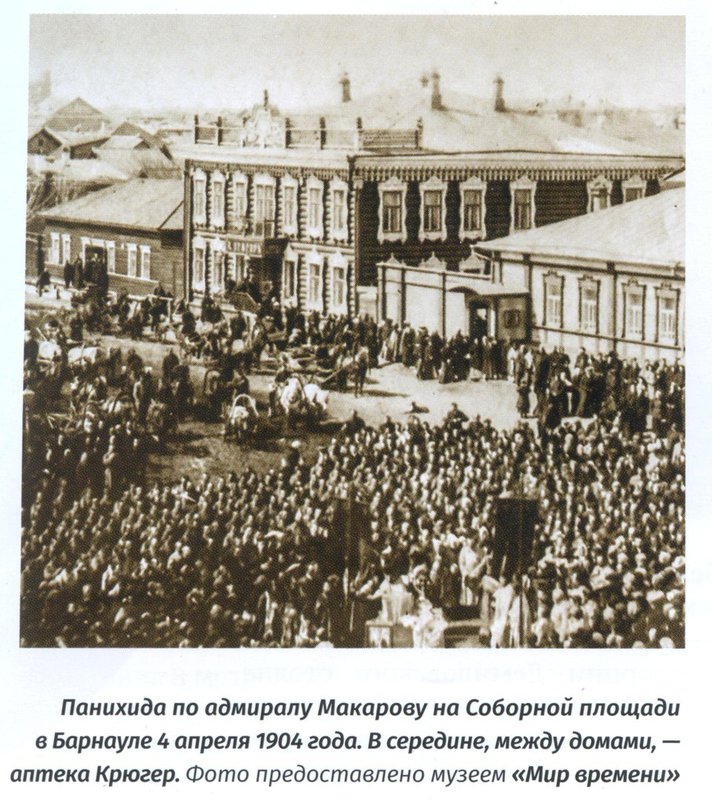 Всем нам известен дом по улице Пушкина, 64, вошедший в историю Барнаула как «аптека Крюгера». Однако, в процессе реставрации облика особняка, а вместе с ним и его истории, выяснилось, что здание принадлежало не Эрнесту Крюгеру, однофамильцу, торговавшему маслом, а Вильгельмине Германовне Крюгер, прусской подданной, прибывшей в Барнаул из Томска с малолетними дочерью и двумя сыновьями. Соответственно, аптека не Крюгера, а — Крюгер. Новые страницы в историю Барнаула вписала заместитель директора музея «Мир времени» Ирина Заречнева. Серьезное изучение фотоархивов, в том числе работа в Томском государственном архиве с лютеранскими метриками на немецком языке, позволили частично восстановить биографию Вильгельмины, урожденной Лидке, а также сдвинуть год возведения здания аптеки с закрепленного в исторических справках, но ошибочного 1912 значительно ближе к началу ХХ века и даже предполагать, что время постройки особняка — конец ХIХ столетия. Теперь можно утверждать однозначно, что в 1904 году здание уже существовало. Оно прекрасно просматривается на фотографии, запечатлевшей панихиду по адмиралу Макарову на Соборной площади.