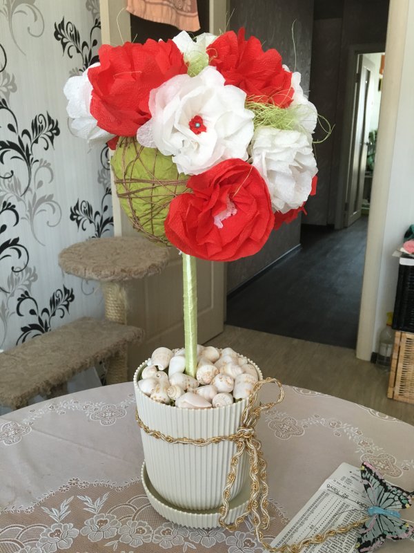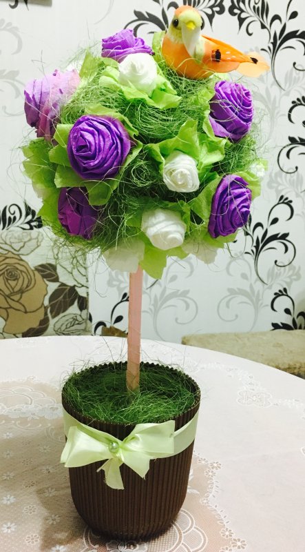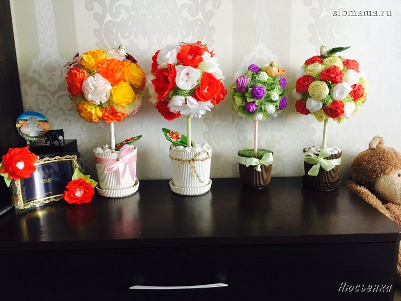 Я тоже поделюсь своими деревьями счастья для родных и близких! Использовала креп бумагу и салфетки цветные! Первый мой опыт был, мне кажется удачным😊