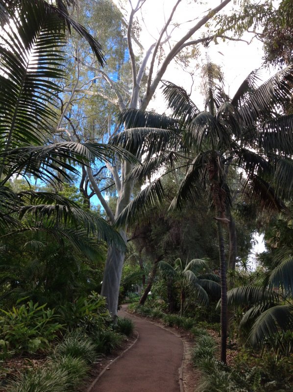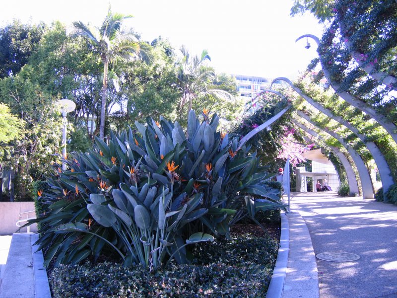 Ну и растительность. Стрелиция, кажется так называется цветок - как яркая птичка. Самое смешное, что я таращила глаза в Австралии, а потом осенью того же года попала в ботсад в оранжерею в Томске. Так вот у них многие эти растительные необычности есть. Слева в кадре арка вдоль дороги в парке увитая бугенвиллеей.