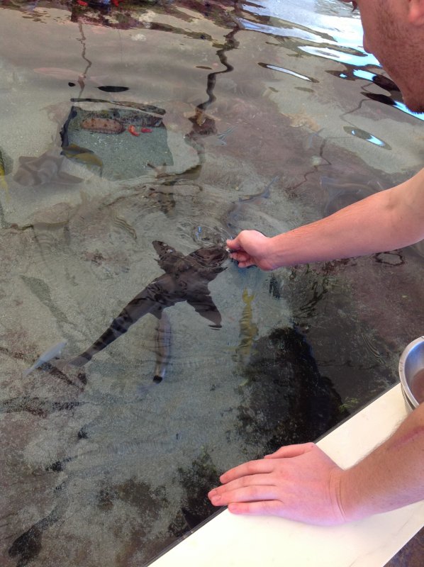 тач пул - место, где можно покормить акул, потрогать морских звезд, морских огурцов, погладить ската, на фото маленькая акула