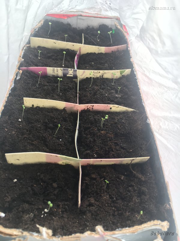 Недельные наблюдения: хвостики появились в среду (4й день), в пятницу уже стояли солдатиками, не больше 5 мм, начала проветривать. В субботу вымохали вдвое. Сегодня подсыпала рыхлой земельки, подокучила. Фото сегодняшние, до и после подсыпки. И, что удивительно, не взошёл один сорт. Сильвер!