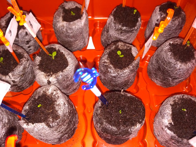 Всходят мои малыши, почти все вылезли, из профсемян все взошли, из цветных пакетиков несколько ещё думают. Чуть углубила их в таблетку, и поставила под светодиоды.