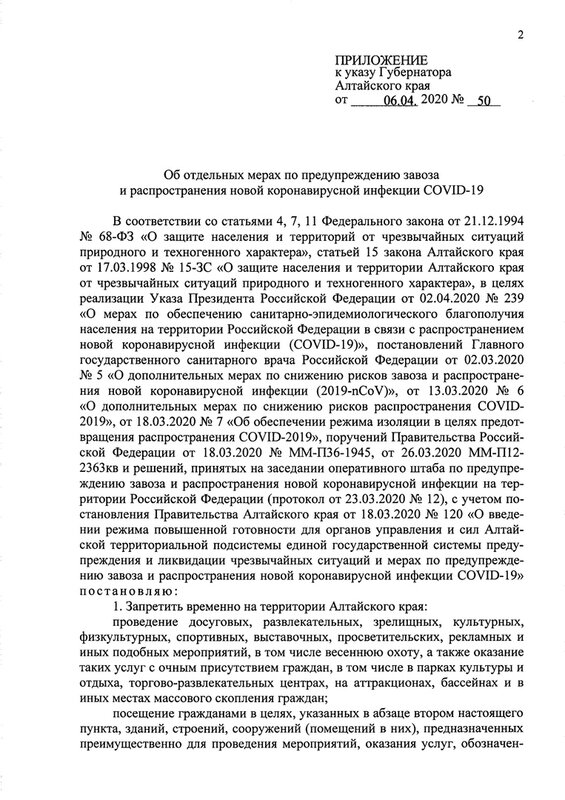 Изменения в Указ Губернатора Алтайского края от 31 марта 2020 года №44 внесены в связи с принятыми 6 апреля решениями Координационного штаба при Полномочном представителе Президента Российской Федерации в Сибирском федеральном округе по предупреждению и борьбе с распространением новой коронавирусной инфекции (COVID-19) на территории Сибирского федерального округа и постановлением главного государственного санитарного врача по Алтайскому краю от 6 апреля «О дополнительных мерах по недопущению завоза и распространения новой коронавирусной инфекции COVID-19 на территории Алтайского края».