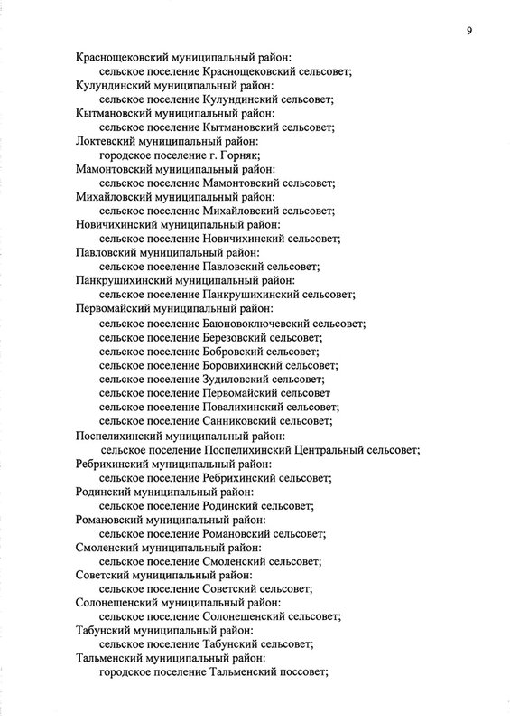 Важно. Теперь требования об изоляции и ограничении передвижения касаются жителей только указанных в указе населенных пунктов. К ним относятся все города края, все райцентры, а также несколько крупных сел. Это Степное озеро (Благовещенский район), Б. Ключи, Березовка, Бобровка, Боровиха, Зудилово, Первомайский, Повалиха, Санниково (все – Первомайский район), Озерки и Новоозерки (Тальменский район).