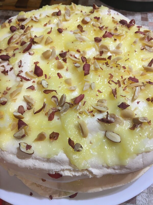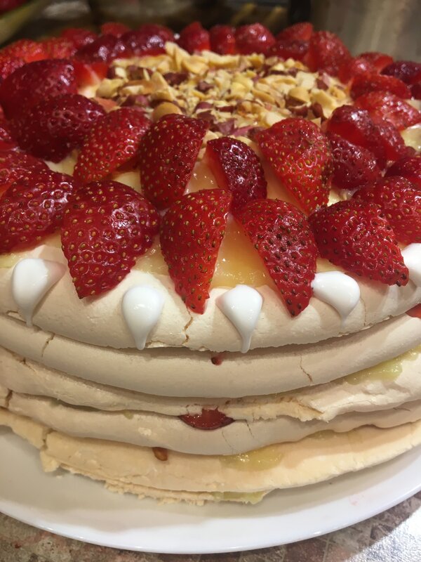Каждый корж чередовала крем + клубника , крем + жареный арахис ( в духовке заранее поджарила )
