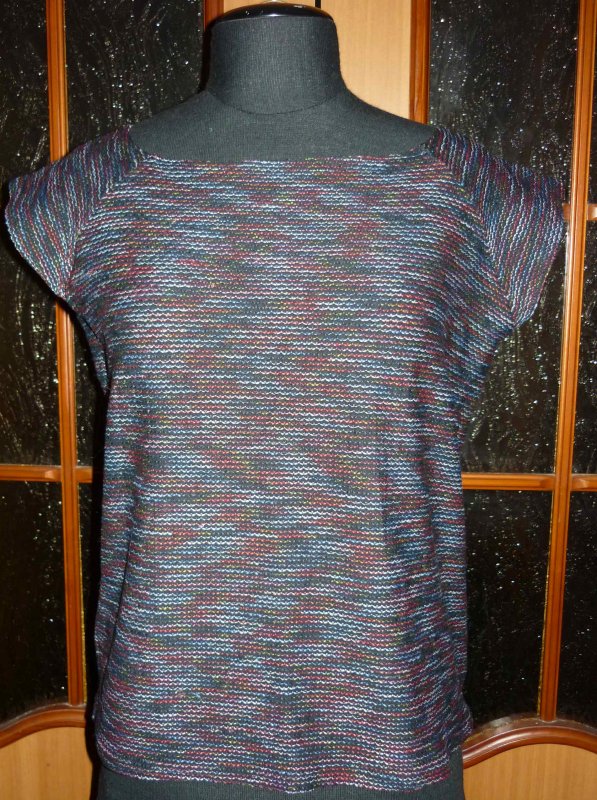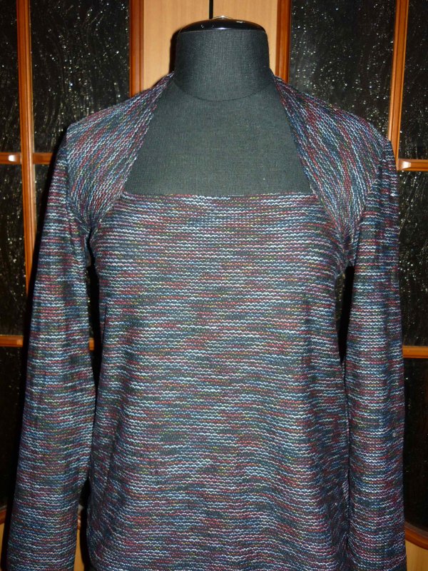 Ты про какой комплект? Если пестрого трикотажа, то это вообще-то изнаночная сторона. Трикотаж китайский, расцветка в стиле барахолочных костюмов, а вот изнанка мне понравилась, с джинсами вообще неплохо смотрится.