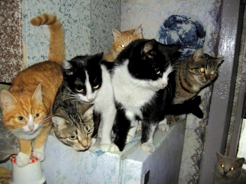 И четвёртая фотография - это его новые друзья кошки. Такие же подкидыши и подобрашки. Живёт Марс с котами очень дружно.