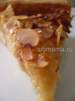 Яйца смешать с медом, добавить лимон, муку, корицу, тщательно перемешать. Вылить заливку в горячий пирог, посыпать миндалем. Уменьшить температуру духовки до 160 градусов и запекать еще 40 мин.