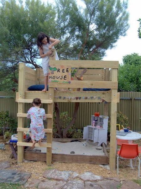Все видели песочницу под крышей. А песочницу под кроватью? Предприимчивые родители без труда сделают такое чудо из брусков и досок. По сути, это обычая кровать-чердак, только устроена она под открытым небом. В результате игровая песочная зона защищена от солнца и дождя, а наверху есть уютное место для отдыха и игр, куда можно добраться по лесенке. Если удачно совместить конструкцию со стоящим рядом небольшим деревом, получится любимая детская забава - домик на дереве, только ниже и безопаснее.