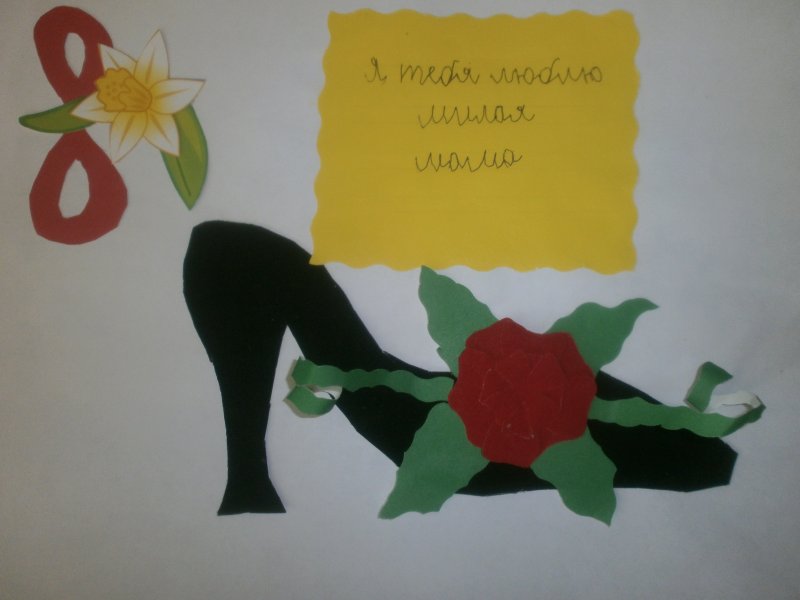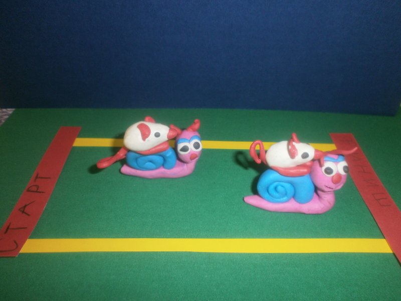 Из работ приложили открытку, которую он делал мне на 8 марта с аппликацией, рисунок, да гонки пластилиновых мышей на улитках