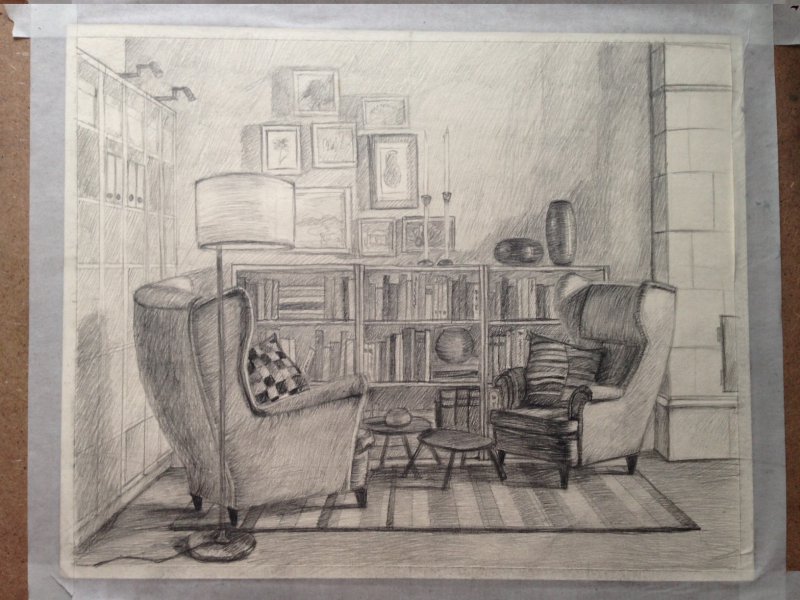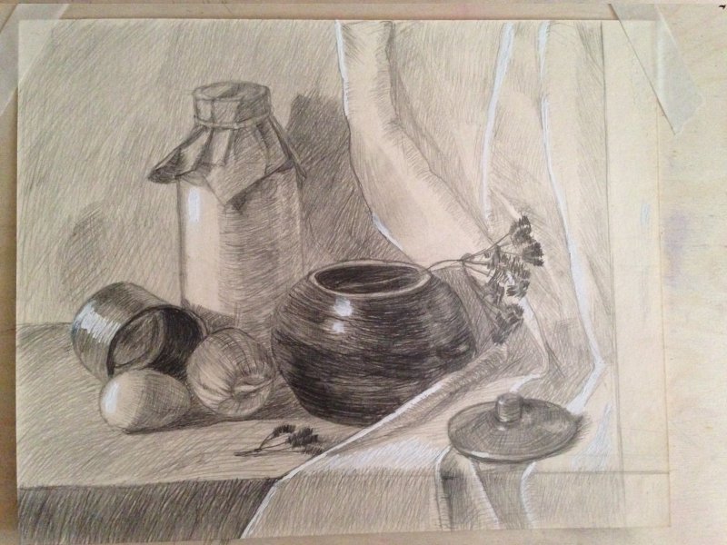 У меня от этого натюрморта был депресняк на пару дней. Казалось, рисую-рисую, ничего не получается. День потратила, чтобы расставить предметы, всё казалось как-то не так стоит. Ещё и яйцо не хотело лежать красиво, всё время скатывалось, так и пришлось рисовать его попом вперёд. Потом день ушёл на компоновку в лист и построение. Там криво линия, сям не симметрично, там пропорции поплыли - жесть.