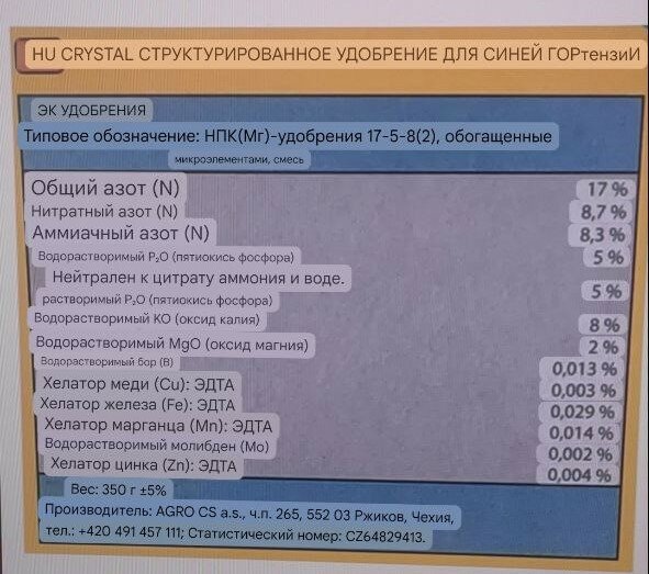 Вот состав удобрения. Написано способствует окраске цветов в синий цвет.