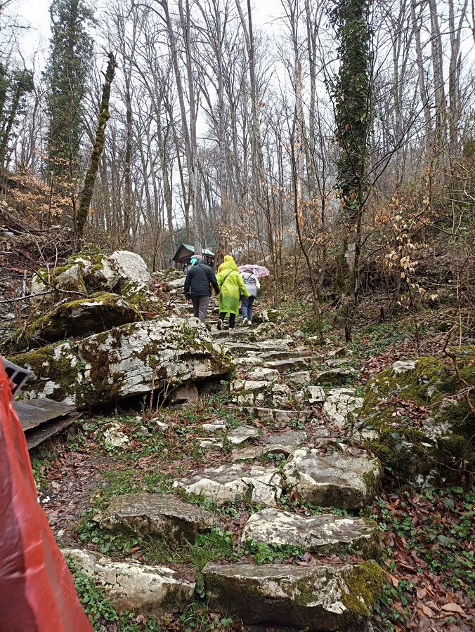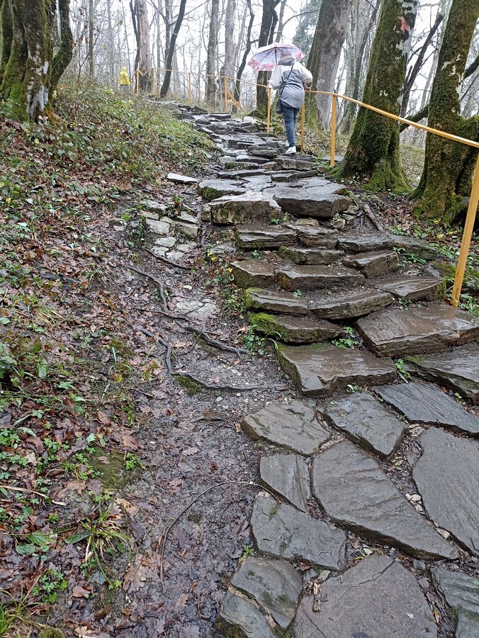 При спуске камни пластами, мокрые, не везде устойчивые, разной высоты.