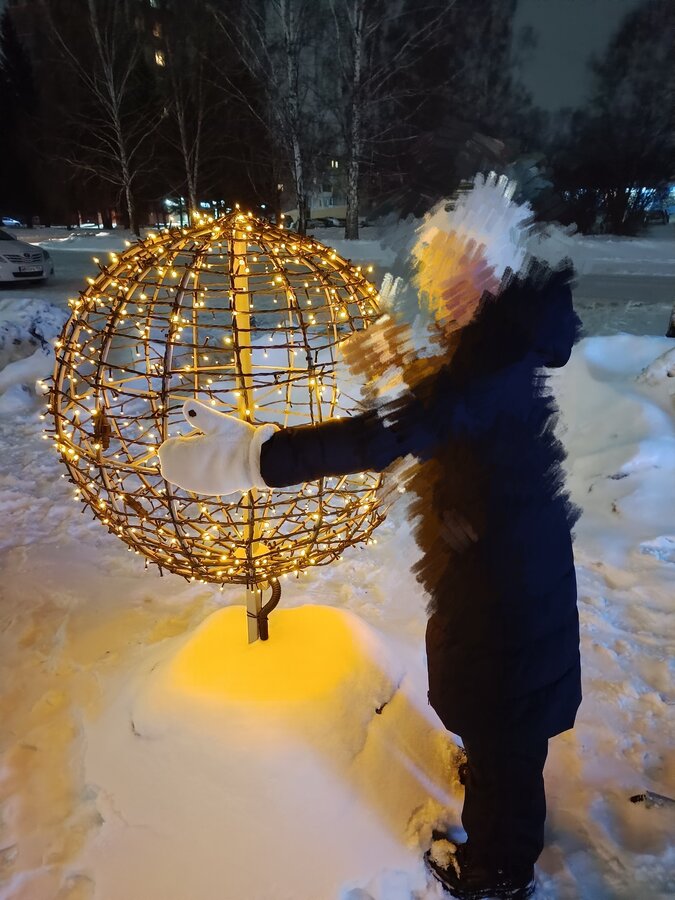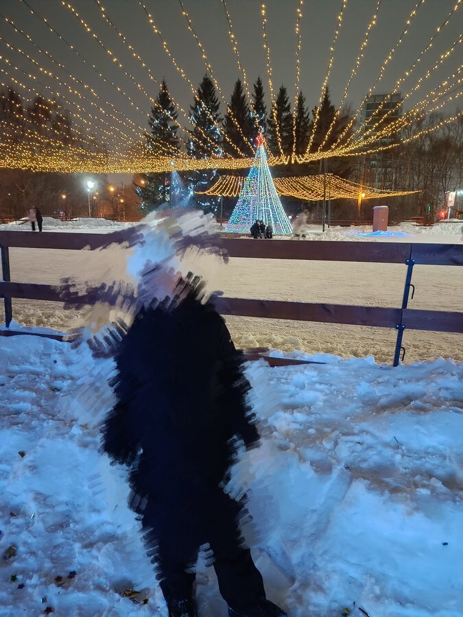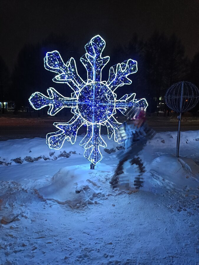 У нас на пл. Кирова, возле администрации в прошлом году так красиво было - большие светящиеся снежинки в метра полтора и шары то же все в гирляндах. И над катком как шатер из нитей гирлянд.
