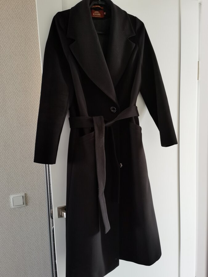 В составе 60% шерсти. В ОТС, на съемном поясе слетело металлическое ушко. ПОГ 47 см, ПОТ 44 см, рукав от плеча - 61 см, длина 102 см.