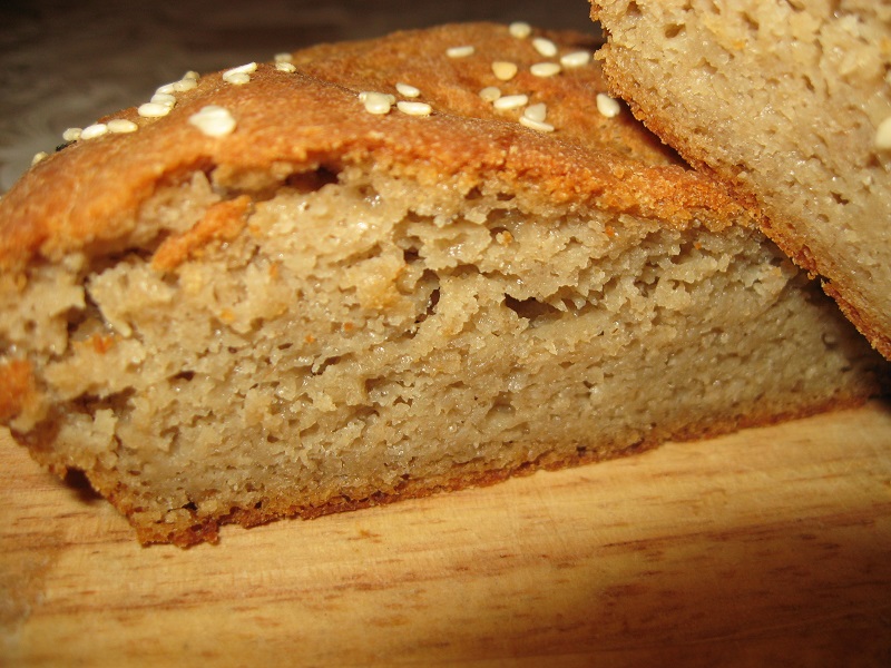 Моей семье постные булки так понравились, что они потребовали "продолжения банкета". Я решила немного изменить рецепт, поскольку купила в магазине муку овсяную и гречневую, ну и вместо булочек решила сделать что-то типа батонов, но не угадала с размером формы. Надо было всю порцию сложить в одну форму, а так они получились низковаты. Впрочем, на вкус это не повлияло, они потрясающе нежные и вкусные.