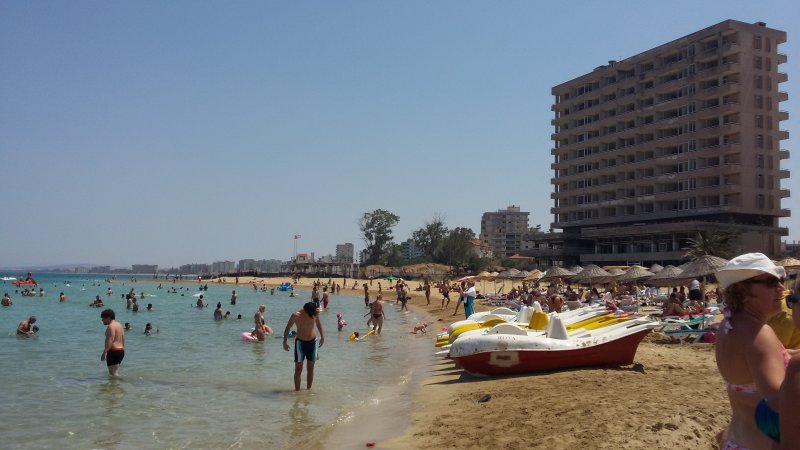 Грустное море. На заднем плане разрушенное здание в городе-призраке Фамагуста в буферной зоне между Северным Кипром и Кипром