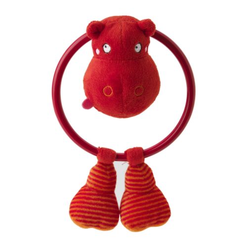 мы с третьего месяца играем с погремушкой из икеи- красным бегимотом, его очень удобно держать) и оттуда же -с тренажёром для младенцев.