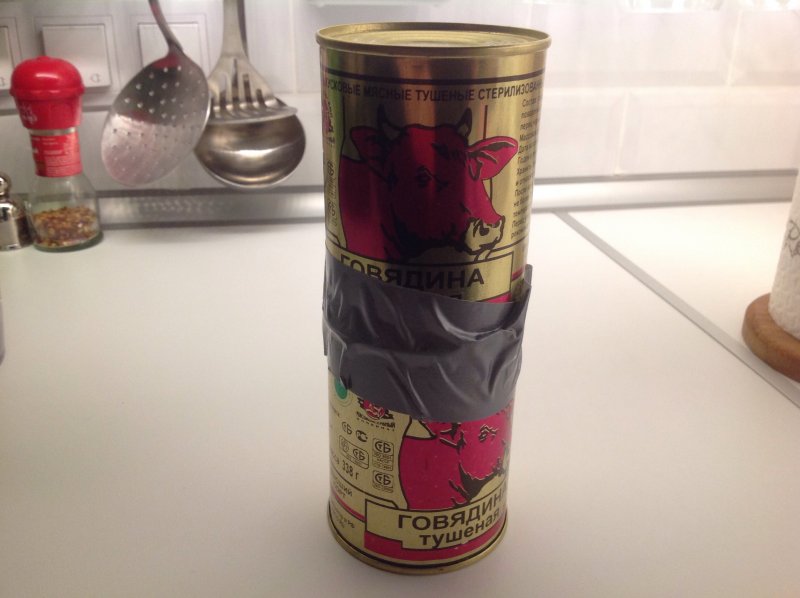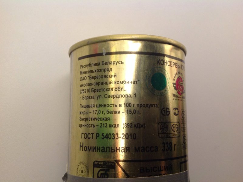 Есть такая замечательная тушенка, пожалуй, самая правильная на Новосибирском рынке. Стоимость около 130 рублей, дислокация - Metro Cash & Carry, как правило прячется внизу, а на виду стоят всякие непутевые главпродукты. Наличие вкусного мяса в ней относительно жидкости и жира - 85-90%. Прикладываю картинки: (это одна на другой банке у меня так хранится) внимание! Наглый главпродукт желая подкосить под дизайн банки с великолепной тушенкой, выпустил нечто похожее, но под своим бренднеймом.