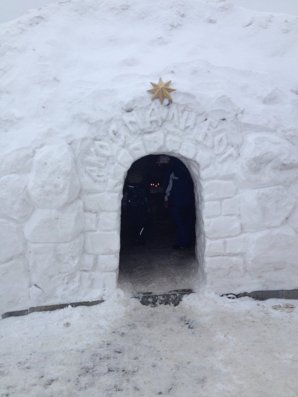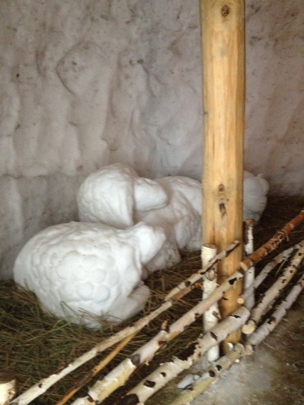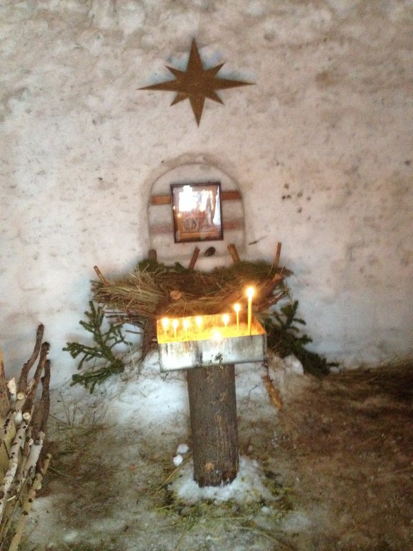 Есть символический на улице, и есть в храме. И выпеченная корова на сене