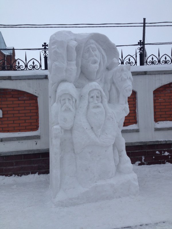 Вот елочки и скульптуры возле храма из снега: