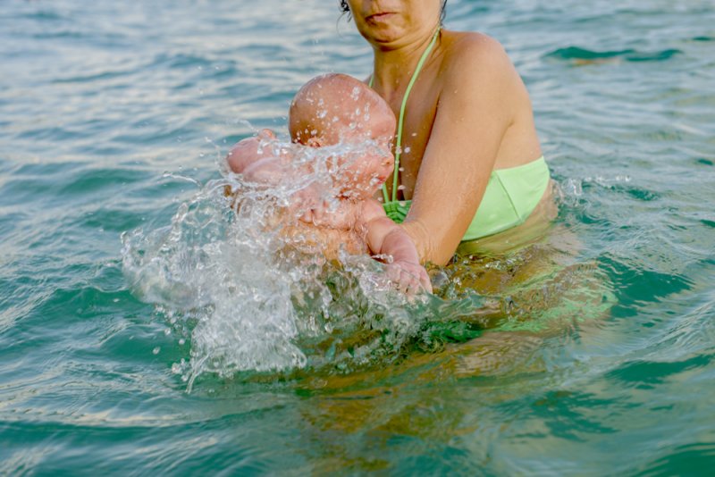 Не ополаскиваем. Целый день в соленой воде. Ополаскиваем только вечером, когда домой приезжаем. Под душем. Когда ныряем у нее глаза открытые. Вода очень комфортна для глаз морская. Щипет только если на воздухе попадает. Она просто отплевывается если хлебанёт, а насчет глаз нет проблем.