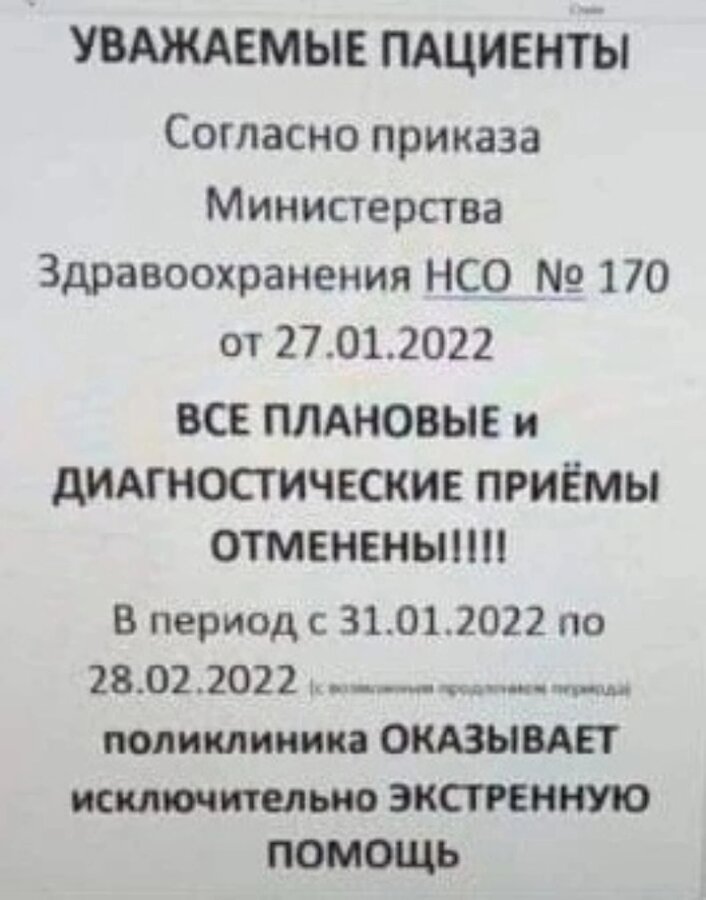 Новосибирцы уже заметили в одной из городских поликлиник объявление об отмене всех плановых и диагностических приемов. Речь идет о детской поликлинике № 22 на улице Зорге, 47а.