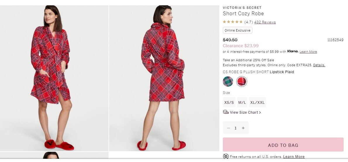 Ссылка: https://www.victoriassecret.com/us/vs/sleepwear-and-lingerie-catalog/victoria-s-secret-short-cozy-robe-5000008347?brand=vs&collectionId=75958adb-2775-4107-826f-f523a91eedce&limit=180&priceType=clearance&productId=8e18fc9b-f1ac-453c-a5d2-7 АРТ/Название: Short Cozy Robe Цвет(копировать: Lipstick Plaid Размер: M/L Замена: -25% Скидка/Примеч: РЦРМаркса [1435.44] получен