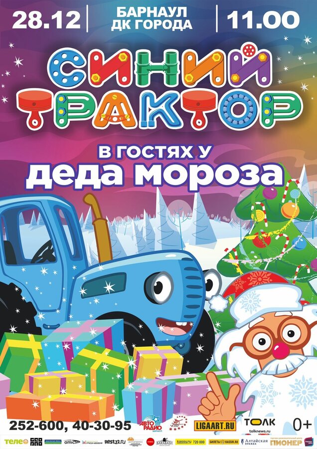 Синий трактор теперь и на сцене! Добрая новогодняя шоу-сказка в мягком плюшевом формате для самых маленьких зрителей. Главный герой Синий Трактор и его новые друзья — Профессор, Девочка Маша и Мальчик Петя — отправляются в увлекательное путешествие, полное приключений, чтобы найти Деда Мороза.