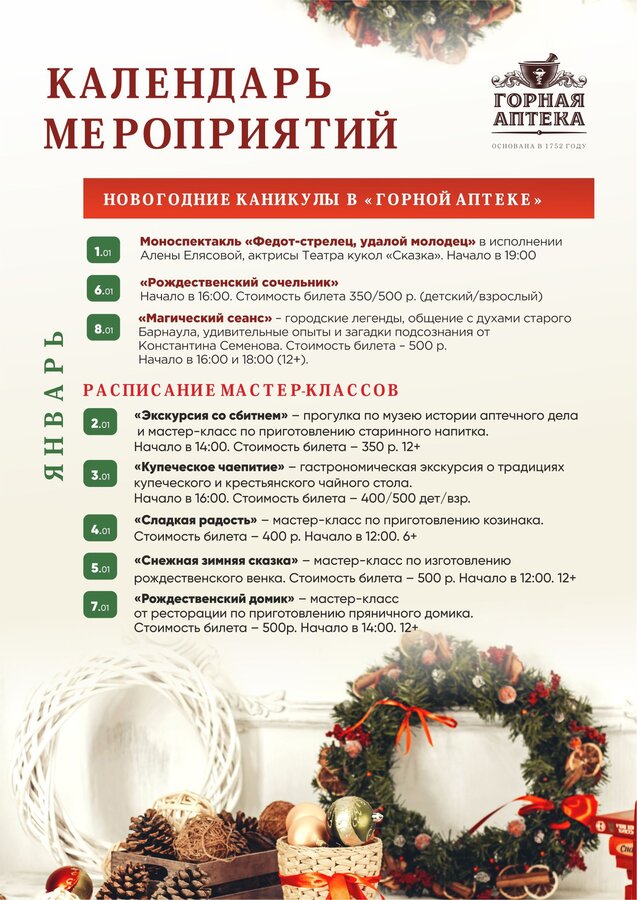 Дом народов Алтайского края (ул. Гоголя, 44) приглашает 24 декабря на традиционный праздник Рождества «Weihnachtszeit!». Он начнется в 14 часов концертной программой, наполненной традиционными элементами празднования, песнями и танцами.